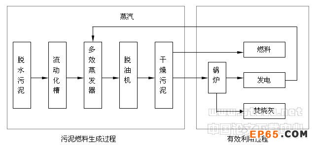 SF法工藝流程如圖2所示。它將未消化的混合污泥經(jīng)過機械脫水后,加入重油,調(diào)制成流動漿液送入四效蒸發(fā)器蒸發(fā),然后經(jīng)過脫油,變成含水率約5%、含油率10%以下,熱值為23027kJ的污泥燃料。重油返回作污泥流動介質(zhì)重復利用,污泥燃料燃燒產(chǎn)生蒸汽,作為污泥干燥的熱源和發(fā)電,回收能量。