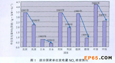 圖1 為部分國家單位發電量NOx 排放情況對比結果,看出世界主要發達國家如美國、日本、英國、德國等,其單位發電量NOx排放水平從1985年到1999年都有大幅降低,我國單位發電量NOx排放水 平從2000年到2007年也有降低,可是與上述國家相比,我國2007 年單位發電量NOx排放水平仍然 高于上述國家1999年的單位發電量NOx排放水平,更高于上述國家同時期的單位發電量NOx 排放水平。