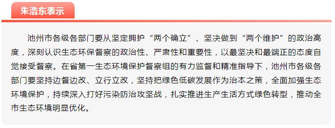 為深入貫徹習近平生態文明思想,認真落實黨中央、國務院關于生態文明建設和生態環境保護的決策部署,全面貫徹全國、全省生態環境保護大會精神,經省委、省政府批準,省第一生態環境保護督察組對池州市開展生態環境保護督察。5月30日,督察進駐動員會在池州市召開,督察組組長盧仕仁、副組長顧群分別就做好督察工作作了講話,市委書記朱浩東進行了進駐動員,市委副書記、市長賀東主持會議。